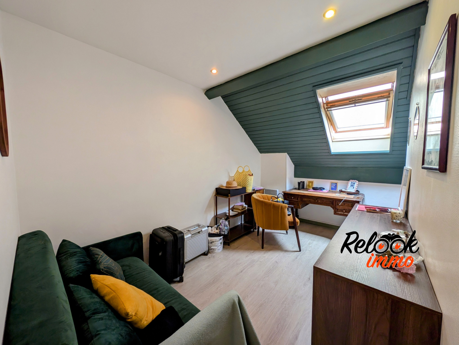 À l’étage, deux chambres mansardées avec vélux, une salle de bains avec WC et un grenier de 10 m² offrant un espace de rangement supplémentaire.